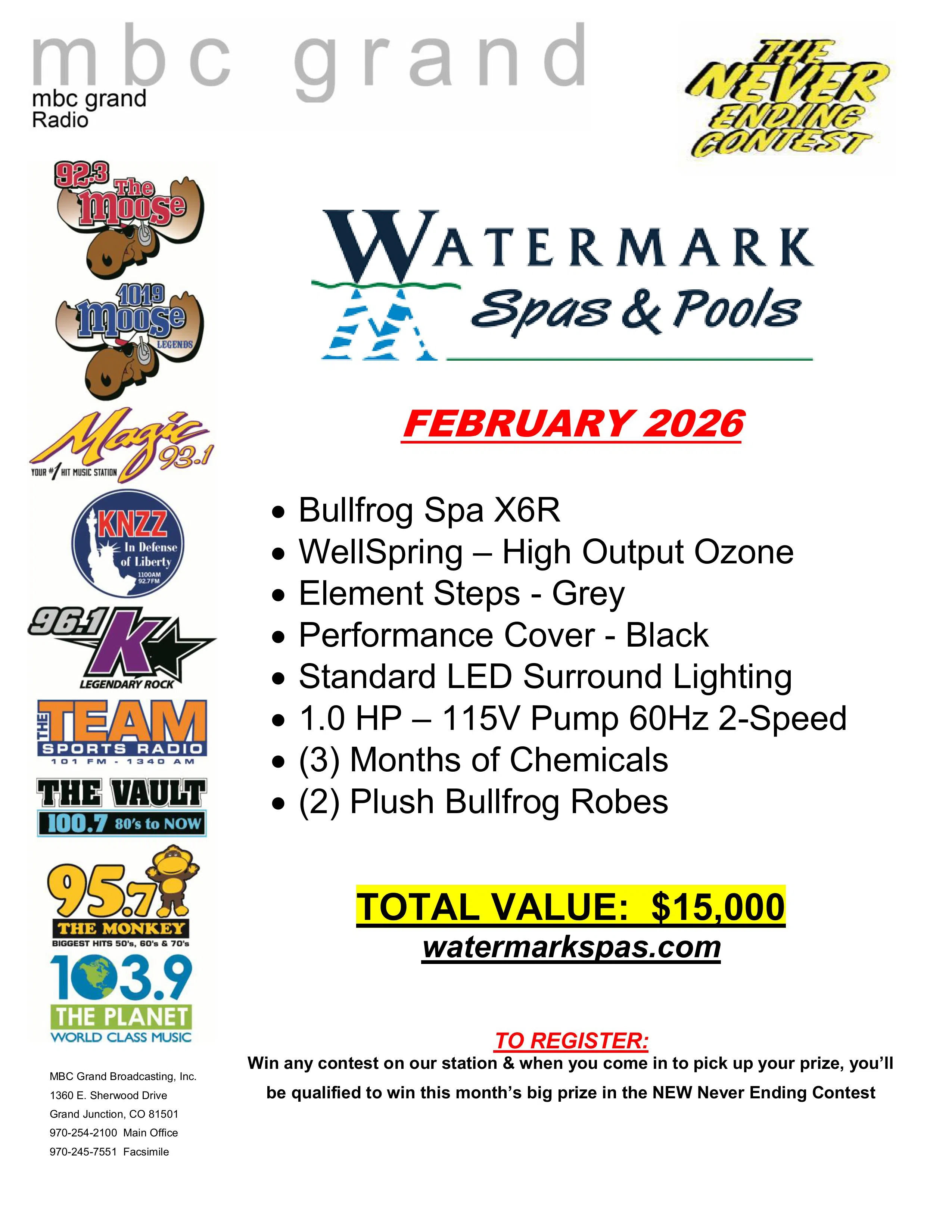 Here’s how it works – win any contest on our station, and when you come in to pick up your prize, you’ll be qualified to win that month’s big prize. Every month it’s a new prize and the best part about it – THE CONTEST NEVER ENDS!